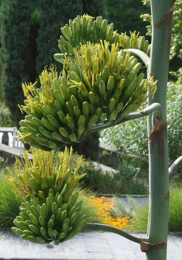 30.08.2012 - Detailansicht der Seitenäste mit offenen Blüten des 1. und 3. Monochasium um 10.42 Uhr Ansicht von aussen (für Besucher nicht zugänglich)